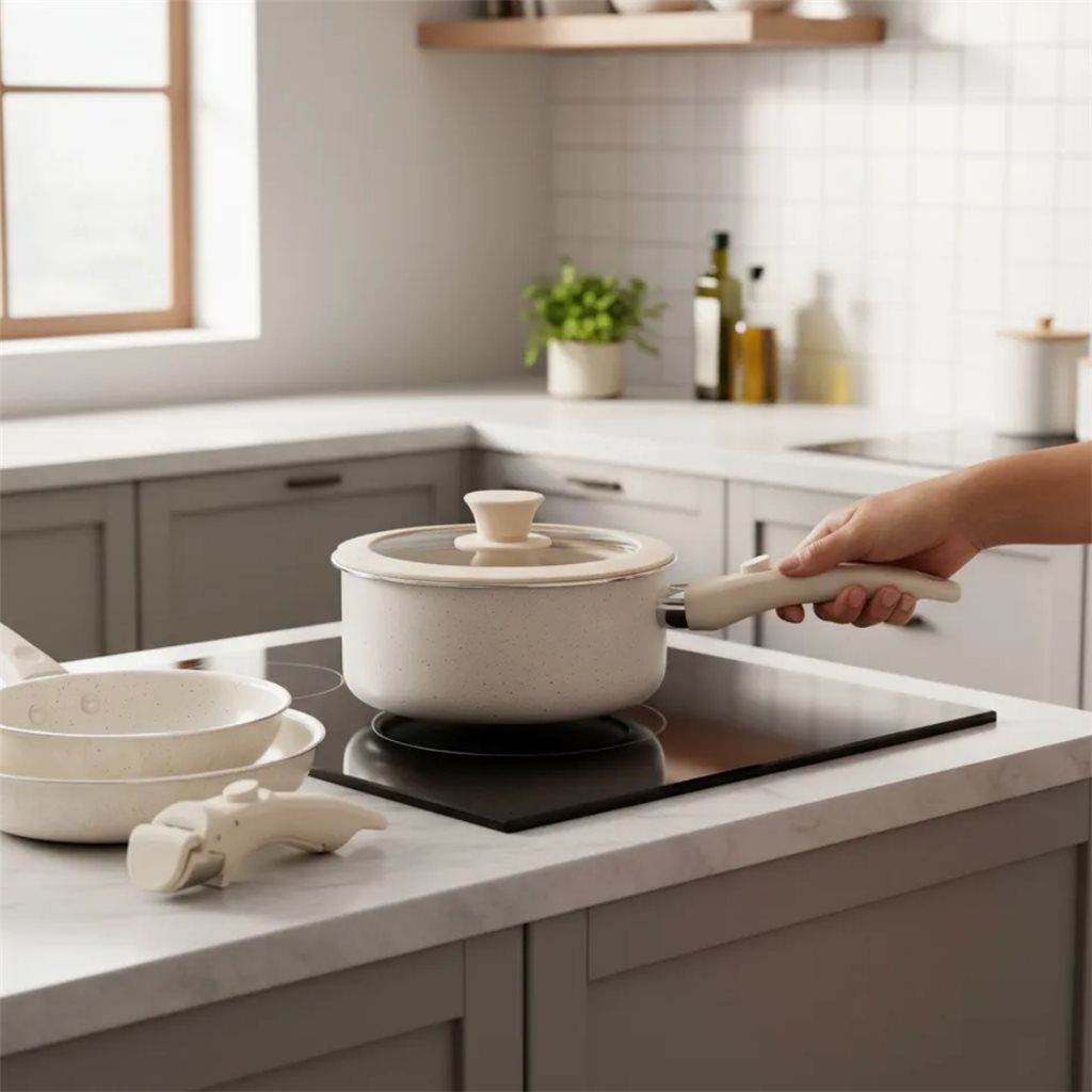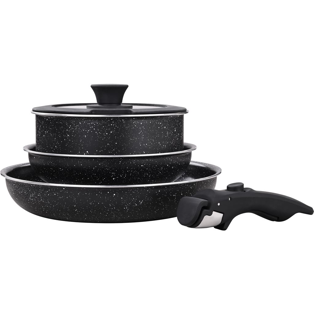 1- Sartén 20cm 1- Sartén 26cm 1- Olla 18cm 1- Mango desmontable 1- Tapa